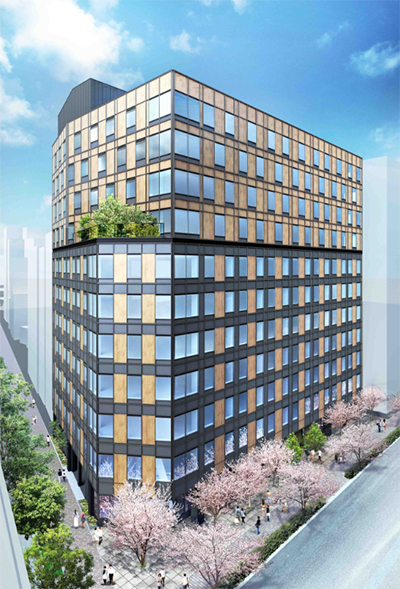 敷地面積約2,000平方メートル、鉄骨造・木造・一部鉄骨鉄筋コンクリート造、地上11階地下1階建て。高層階の8~11階では、主要構造部である床・壁・柱・梁などに木材を活用し、純木造のオフィス空間を実現した。低層階の2~7階においても主要構造部の一部にて木造耐震壁を採用している。