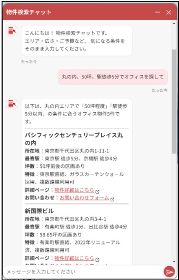 そこで検索負荷の軽減と利便性の向上を目的に、AIチャットボットによる物件検索機能を導入したもの。自然言語検索や対話型絞り込み、β版運用などを可能とした。ユーザーが「丸の内、50坪、駅徒歩5分」といった単語や文章を入力すると、AIが条件を解析。候補物件を提示する。