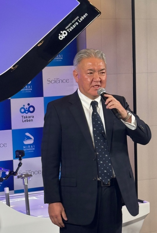 デモンストレーションに先立ち挨拶したタカラレーベン代表取締役兼社長執行役員の秋澤昭一氏は、「ミライ人間洗濯機は、大阪・関西万博の中でも特に人気のコンテンツだった。当社のマンションに採用されているルイックプロジェクトのミラブルシャワーは、微細な泡が含まれており、身体をこすらなくても汚れを落としてくれる。この人間洗濯機の中にも、同じ仕組みが使われている。この感動を多くの方に体感いただきたい」と抱負を述べた。