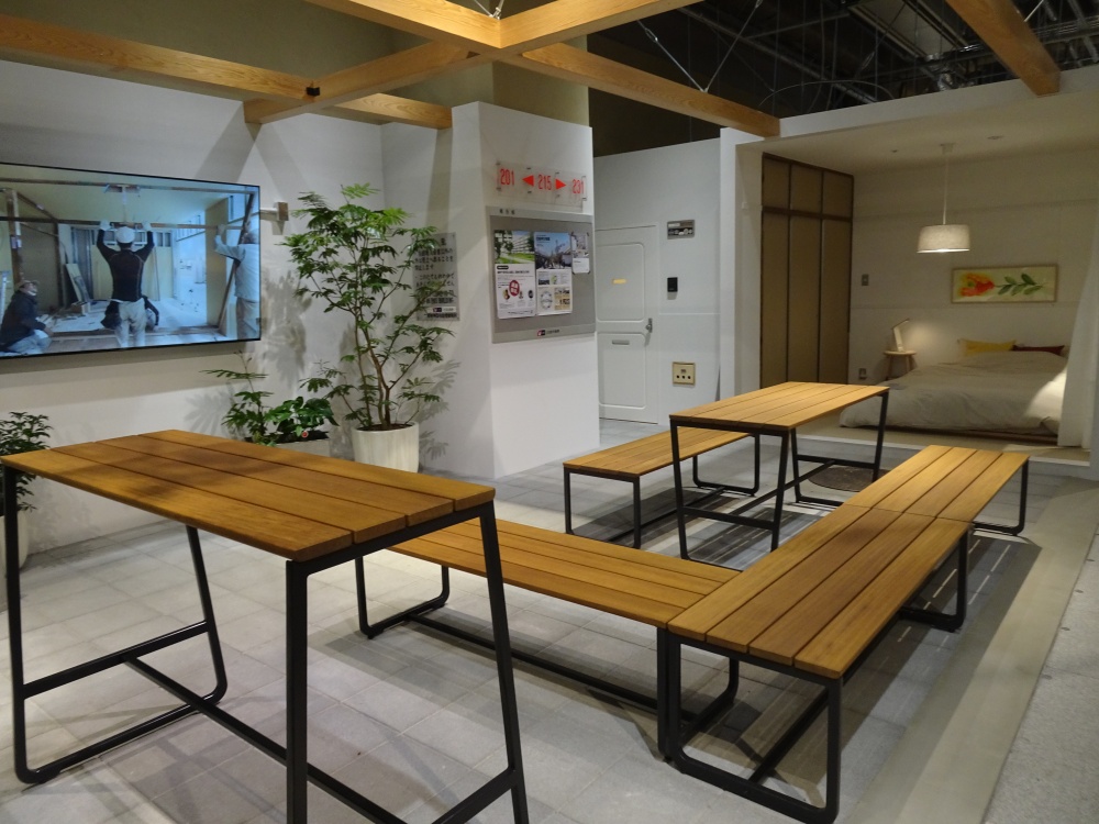 モデルルームは、団地屋外ひろばと屋内空間(3DK)を表現した。建て替えのため除却されることとなった東中神団地(東京都昭島市)等から、敷居や鴨居、柱、玄関ドア、マンホールなどを移設。段ボールの素材を生かしたふすま、床座でもイス座でも使用できる麻畳なども取り入れ、温かみや味わいを残しながらも、現代的で洗練された暮らしを提案する。