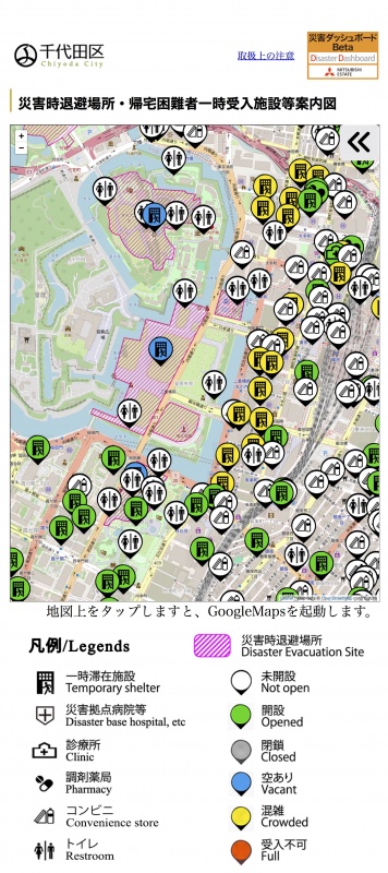 現在、「災害ダッシュボード」と「東京都帰宅困難者対策オペレーションシステム」のシステム接続回収を進めていることも明らかにした。今後、千代田区とその周辺5区を加えた帰宅困難者一時受入施設の情報を展開する計画としている。