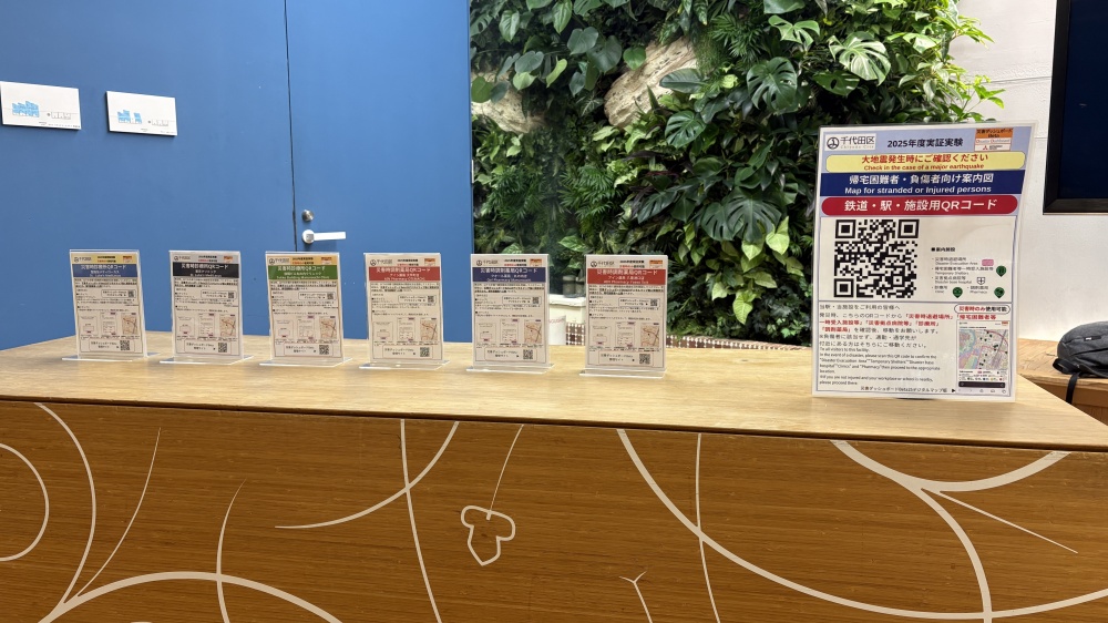 また、「神田」駅西側にある区民避難所の「千代田区立スポーツセンター」では、帰宅困難者が立ち寄った際、周辺の帰宅困難者一時受入施設への移動を促すため、区民避難所の標識とともに災害ダッシュボードの二次元コードを掲出する実験も実施した。