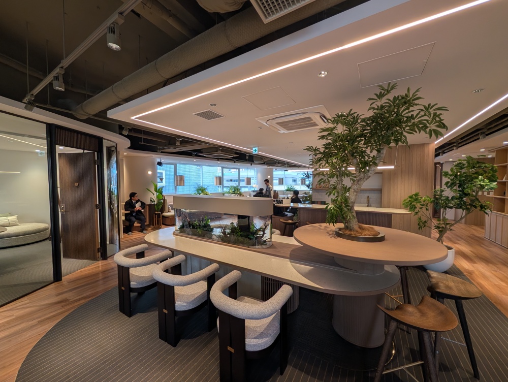 1階と6階には、同ビルのワーカーが自由に使える計300平方メートル超の共用ラウンジを設置。Webブースや会議室などを備えたほか、さまざまなテーブルセットを配置。ワークスペース、打ち合わせ、交流などにも使える多様な空間を整備した。1階には実際に火をたくことができる暖炉を、6階にはアクアリウムのほかテラスを設置している。