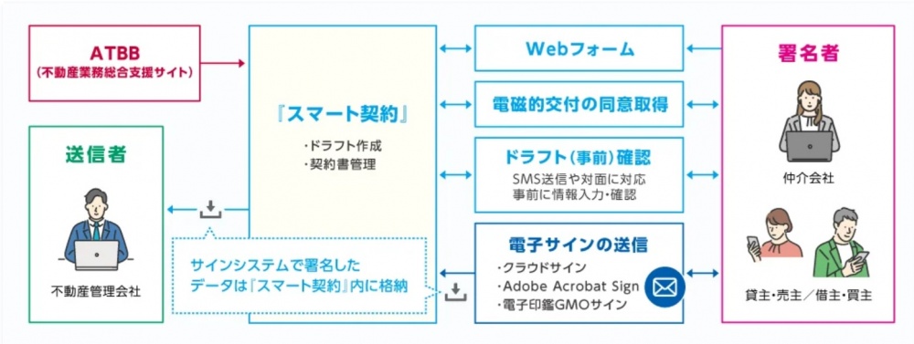 「スマート契約」は、従来の紙の契約書に比べ、人件費・郵送費の削減、リードタイムの短縮等、不動産会社の業務の効率化等につながっている。一方で、宅地建物取引業法等の各種法令では、電磁的交付には事前の同意取得が必要と定められているため、これまでのスマート契約では、同意取得をシステム内で完結することができなかった。