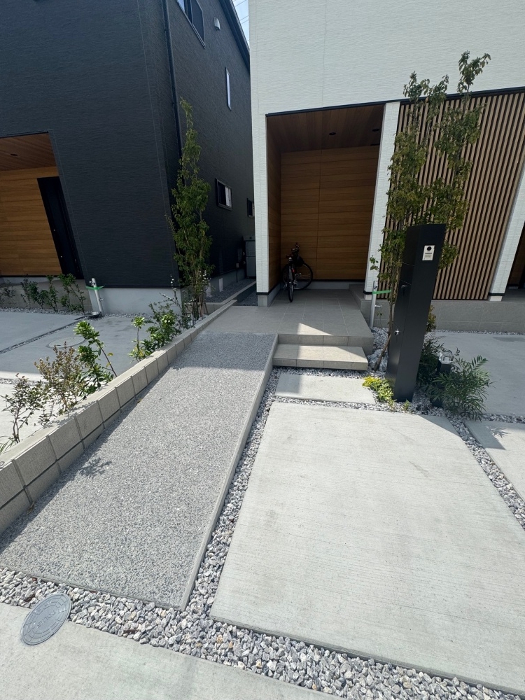 南側に玄関と庭、カースペースを配置せず、北道路側に玄関とカースペースを配置している。カーポートは、1戸を除き並列として駐車がしやすいように配慮。玄関をセットバックしてポーチと軒天を延ばして自転車等の「収納」場所とし、その近くにシャッター付収納やコンセント、立水栓も配置した。敷地内道路から自転車等を出し入れするためのスローブは、過去の「BASE88」入居者の意見を反映して幅1m以上を確保し、濡れていても滑らないようモルタルではなく洗い出し仕上げとした。自動車の駐車を妨げないよう、植栽配置も適正化している。