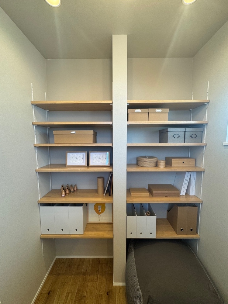 すべての住戸のすべての居室に、多目的に利用できるオープン収納「ミセラック」を設置。6つの可動棚を使い、文庫本や趣味の雑貨、フィギュアなど、収納としてだけでなく、見せたいものを飾るスペースとして提案している。その他、パントリー、土間収納、ホール収納、リネン庫、オープンクローゼットなどを住戸ごとに適正配置。また、北道路としたため、南側の1階採光が取れない4戸は、リビングを2階に上げている。