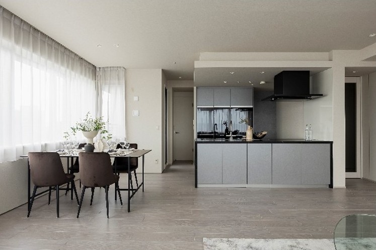 両物件ともパナソニック ハウジングソリューションズ(株)の商品を採用。「梅田」の1室(間取り2LDK、専有面積80.84平方メートル)では、広がりを感じられる明るい色柄の建材を採用し、さらに内装や建具を壁・床・天井と一体で捉える設えにより、空間全体の一体感を向上させることに成功。実際の面積以上に広く感じられる印象を演出した。モデルルームとして11日より公開を開始した。