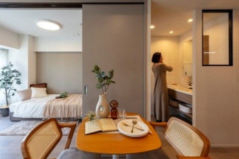 「武蔵小山」の1室(間取り1LDK+S、専有面積43.53平方メートル)では、洗面化粧台をLDKに設置することで、住まいの動線上で多用途に使える空間として提案。身支度や手洗いに加え、家事や日常の軽作業にも利用しやすくした。すでに販売済み。