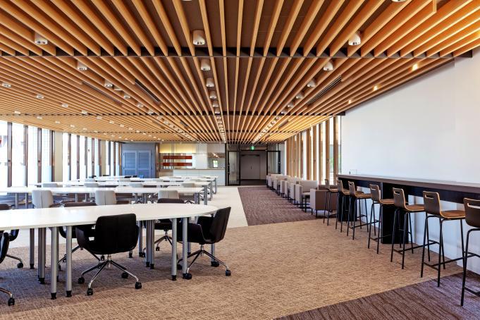 同社が空きビルとして取得し、事務所として利用できる物件にバリューアップした。エントランスやラウンジのデザイン性を向上させ、中庭の植栽は植え替えを実施。元食堂だったスペースはフリーアドレスの執務空間とした。
