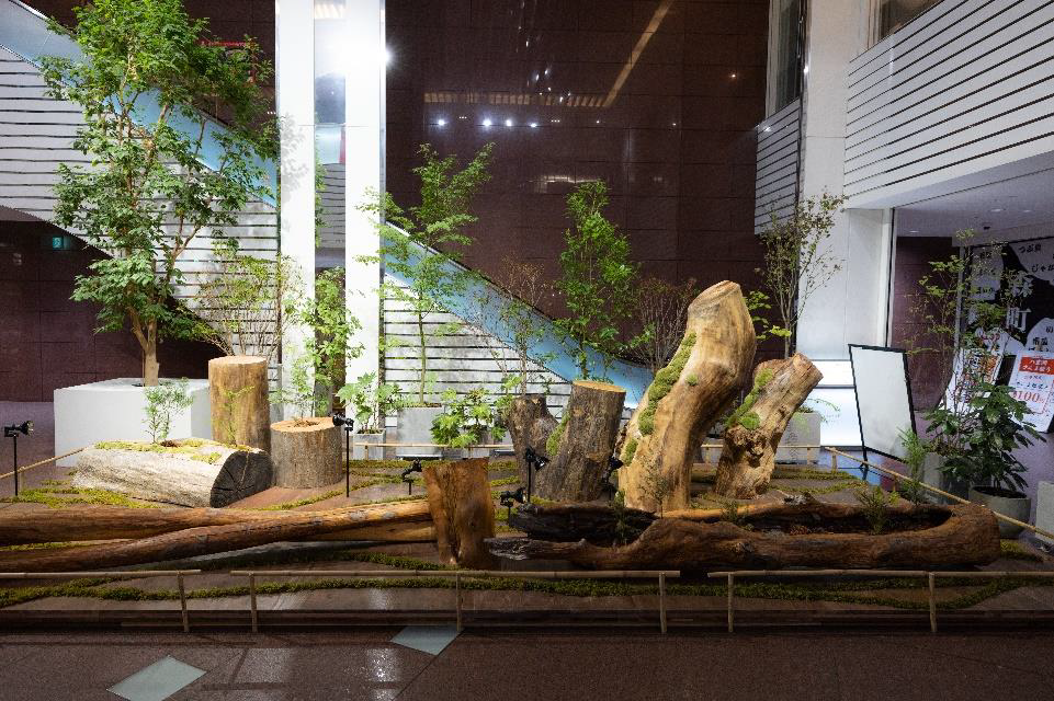 雷で割れたり2本の木がくっついたりしたものなど価値がつきにくい木材を使用した「木庭 MOKUTEI」を、同ビル地下2階の八重仲ダイニングに設置。苗木や植栽は、木材の原産地である東京都西多摩郡檜原村の生態系を再現。ビルのワーカーや来館者、通行人が苗木や苔に水を吹きかけることで苗木が成長していき、1~2年後には成長した苗木を檜原村の自然環境に植樹する。