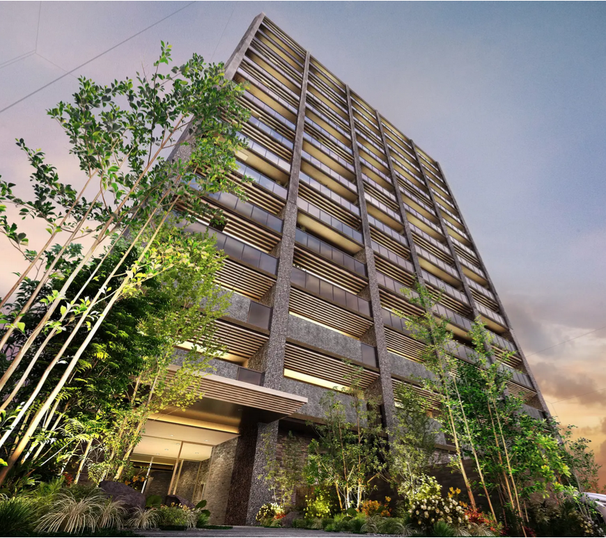 敷地面積約910平方メートル。鉄筋コンクリート造地上15階建て。外観はグレイッシュなカラーを基調とする。周辺の公園に植えられている植物を敷地内の植栽計画に多く採用することで、周辺の緑や自然との調和を図った。住戸は間取り2LDK~3LDK、専有面積約55~70平方メートル。柱を室内に出さないダブルアウトポール工法と6m以上の間口を確保したワイドスパンを採用し、通風・採光に優れた住空間とする。