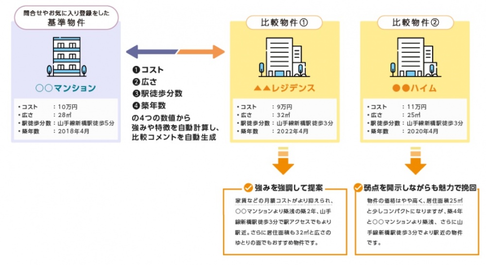 「ダイナミック比較コメントシステム」では、消費者の趣向に沿った居住用物件を、基準物件としてピックアップされたお勧め物件と比較し、その違いをまとめた推奨コメントをレコメンドメールに掲載する。消費者は、自分に最適な物件を迅速・効率的に見つけることができる。
