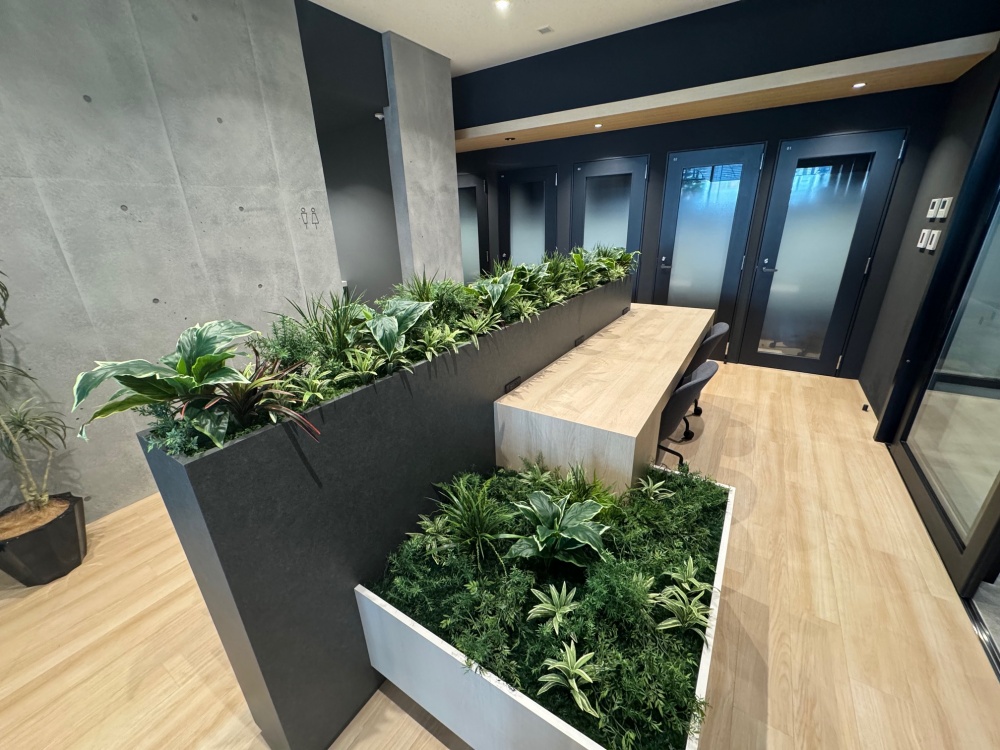 1階は共用スペースとして、ミーティングルーム、シェアラウンジ、テレカンブース5台を設置。2階以上のオフィスフロアは、専有面積約178~181平方メートル。水回り2ヵ所、OAフロア、照明コントロール、BGM設備などが標準。