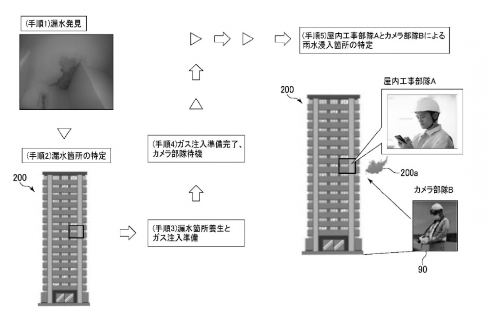 特許を取得した手法は、検出用に混合した安全なガスを漏水箇所から注入。検出用ガスを可視化するカメラを用いて建物外部から撮影を行ない、雨水の浸入箇所を特定するというシステム。