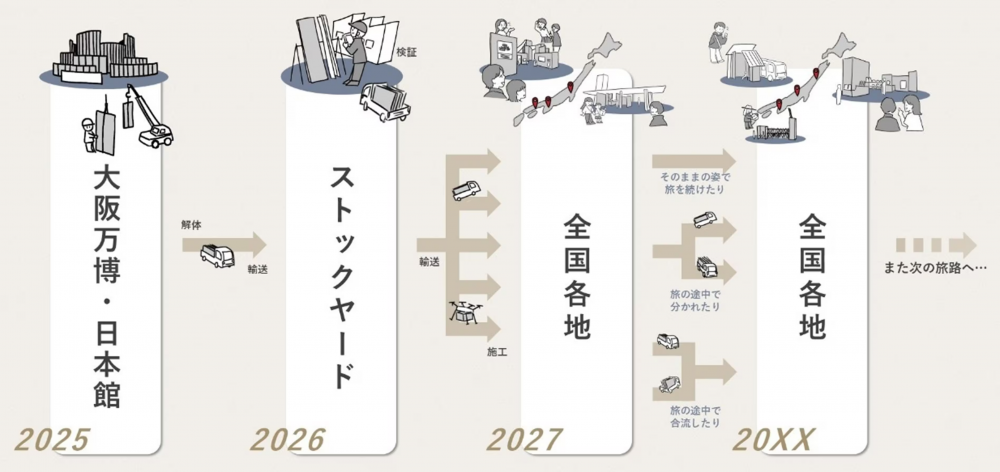 再利用における検証や試行を重ねた後、2027年以降に同パネルを再利用した建築物等を日本各地で施工・制作。その後も解体と再構築を繰り返すプロジェクト。