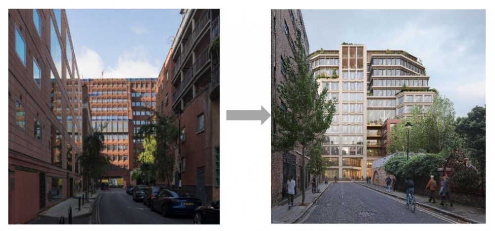 ロンドン有数の商業・劇場エリアであるSohoやCovent Gardenに近接し、「Tottenham Court Road」駅徒歩3分の立地。計画敷地は約3,590平方メートル。既存躯体の約75%を活用しつつ2層を増築し、延床面積約2万2,862平方メートル・地下1階地上11階建ての建物を、延床面積約3万3,487平方メートル・地下1階地上13階建てのオフィスビルに改修する。