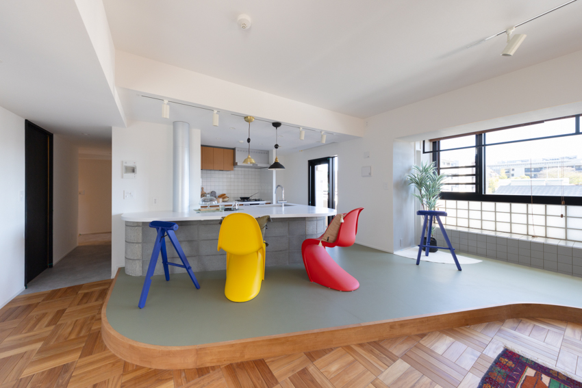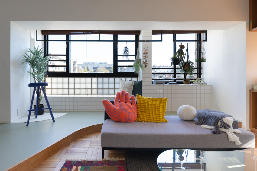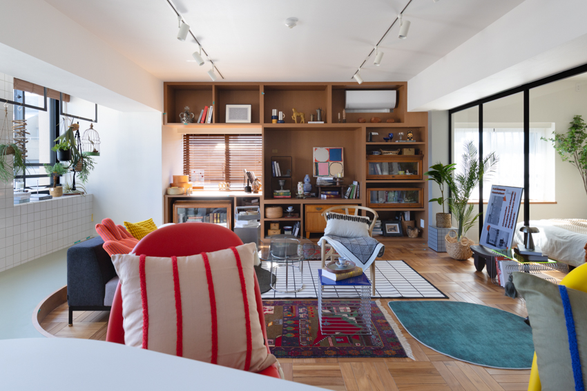 従前の3LDK・約76平方メートルを、DINKSやプレファミリーをターゲットとした2LDKへリノベーション。工芸やアート、本などモノの収集が趣味のユーザーを想定し、それらのモノで空間を埋め尽くす家をコンセプトとした。企画から竣工まで1年を費やしている。