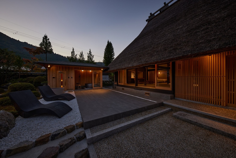 1日にはフラッグシップ施設「えにし美山-霞月」(京都府南丹市)を開業。築年数も定かではない茅葺の古民家をベースに、地元の茅葺職人や大工の手によって再生した。茅葺屋根や梁など、元の古民家の姿はできる限り残しつつ、現代の滞在には不可欠な断熱性能を確保。サウナや半露天風呂をしつらえた。畳敷きのリビングの開口部からは、周囲の自然や中庭の景色を望むことができ、ダイニングエリアは黒を基調とした落ち着きのあるデザインに仕上げている。