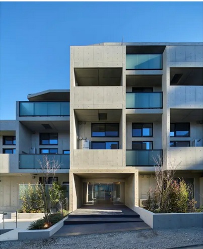 建物のエントランス部は4層を吹き抜けとして東西方向に切通しのような空間を設けた。前面道路から隣地の神社の緑に向けて視線が抜けるように工夫したことで、開放感と緑を取り込んだ全体設計としている。住戸内は、壁式構造により柱をなくし、1.5層分の天井高を確保。1階の共用部にはワークスペースを設け、居住者は専有部にとらわれることなく建物全体を利用できるフレキシブルな住まいとしている。