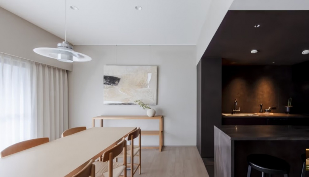 キッチンは廊下を取り込み面積を拡大。背面に大型のカウンターテーブルを設置。キッチンやカウンターの面材、天井塗装・床タイルなどを黒で統一し、ベージュ調でまとめたリビングと視覚的に各空間を間仕切り。フローリングも、廊下からの縦方向ではなく、横方向に張ることでそれぞれの空間を視覚的に際立たせている。キッチンの冷蔵庫置き場や家電置き場はリビングから見通せない場所にして、極力生活感が出ないよう配慮した。