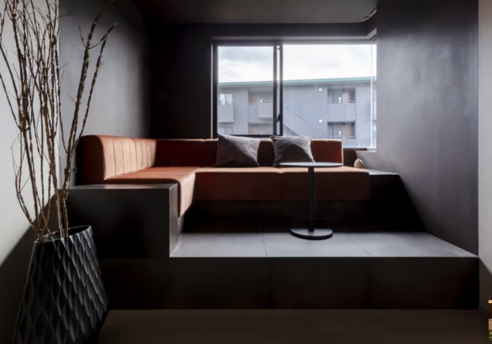 同物件は壁式工法のため、大幅な間取り変更はできなかったが、LDKと隣り合う和室を取り込み面積を30畳まで拡大。元和室の窓際にヌックを設けた。最上階で最大天井高が3,000mmと余裕がある反面、勾配天井かつ直床だったため二重床に変更し、天井もあえて2,700mmと高さを抑え天井カセットエアコンを設置。室内の凹凸(ノイズ)を極力なくし、すっきりとした空間に見せている。ヌック前の梁は床を上げたことでさらに低くなり、リビングの雰囲気を感じつつ、適度な「こもり感」を演出。ヌック自体は20cmほど床を上げ、キッチンやリビングにいる人と目線が合うようにしている。
