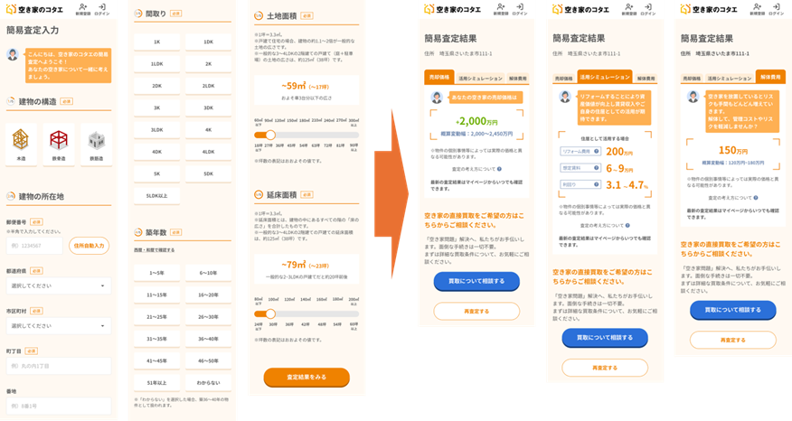 空き家所有者が建物構造、所在地、間取り、築年数、土地面積、延床面積を入力すると、売却価格、賃貸で活用した際の収益シミュレーション、取り壊し費用の概算の3種の査定額を表示する。売却価格については、個人売買価格、事業者買取価格、さらに三為取引価格の3種の価格を算出・表示する。