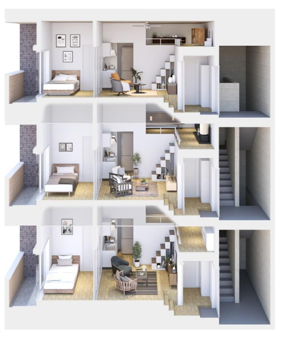建築基準法の改正により、構造計算上の高さ制限が緩和されたことを受けて開発。全室ロフトを設けた木造3階建て賃貸住宅の商品化は日本初だという。従来の「平面」の最大化に加え、新たに「高さ」を掛け合わせた「立体(空間)」の活用を追求。これまで2階建てを中心に実績を積み上げてきた仕様を、3階建て新シリーズにも実装することで、競争力を強化した。