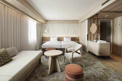 環境と共生するホテルを目指し、館内各所にサステナブルな素材を採用。レセプションカウンター等には同グループが北海道に約5,000ha保有する森林の間伐材を使用する。同グループの三井デザインテック(株)が4月から提供を開始する、家具のサーキュラーデザイン実現支援サービス「CIRCULAR FURNITURE」の設計思想に基づき、レセプションカウンターや客室のヘッドボード等について脱炭素や環境負荷を抑える家具作りにも取り組む。