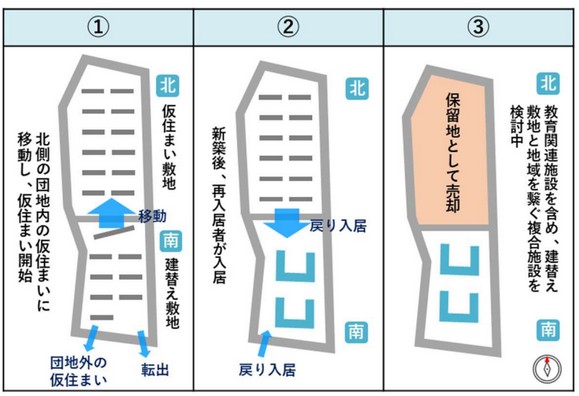 建て替えを進めるに当たり、希望者全員が団地内で仮住まいできる仕組みを整えた。敷地北側の団地内に仮住まいを設け、希望者が移動。マンションを新築した後に再入居者が入居し、仮住まいしていた北側の団地は解体。保留地として3万9,465.78平方メートルを売却、教育関連施設を含め、建て替え敷地と地域の交流を深める用途での複合施設建設を検討している。