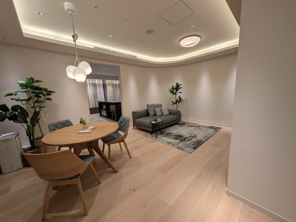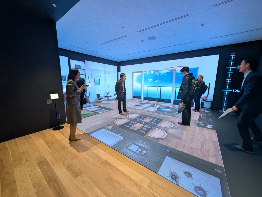 約500坪の「ゲストサロン」と約400坪の「オーナーズサロン」で構成。「ゲストサロン」には、70平方メートル台・90平方メートル台の2つのコンセプトルームを用意。その他、天井と壁2面の計3面にLEDで空間を投影してさまざまな物件・間取り等を実寸大で再現・体感できる「カスタマイズビジョン」、ヘッドセット「Apple Vision Pro」を使って竣工前物件のエントランス、共用空間をXR(複合現実)により没入体験ができる「アップルビジョンキューブ」なども導入している。