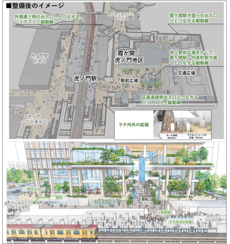駅出入口および駅施設の敷地内移設などによって、駅北側の改札外コンコース拡幅・ホーム拡幅等の駅改良を行なう。また、バリアフリー動線の整備、地下歩行者ネットワークの延伸などにより、交通結節機能を強化。駅前広場には緑豊かな屋内空間を設け、クールスポットや災害時の一時滞留スペースとして機能させる。