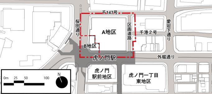 計画区域は、東京メトロ銀座線「虎ノ門」駅に近接する約1.4ha。敷地面積約7,320平方メートルのA地区には地上28階地下4階建て、延床面積約15万1,800平方メートル、高さ約179mの建物(主要用途:事務所、店舗、ビジネス支援施設など)を、敷地面積約750平方メートルのB地区には地上12階地下2階建て、延床面積約9,400平方メートル、高さ約60mの建物(主要用途:事務所、店舗など)を建設する。