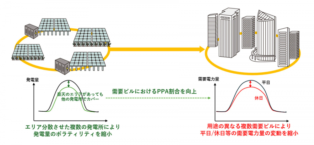 同発電所の運転開始に合わせて、同社は、関東エリアに点在する同社の再エネ発電所と東京都心部で同社が管理・運営する物件との間で、新たなPPAモデルによる再エネ電力ネットワークを構築した。エリア分散させた複数の発電所をつなぐことで発電量のボラティリティを縮小すると共に、平日日中に需要の多いオフィス、休日に需要の多い商業施設やホテル、といったさまざまな需要体系を持つ物件を1つに見立てて電力を供給。これにより、時間帯や曜日による需要電力量の変動縮小も実現させる。結果、全需要電力に対するフィジカルPPA供給比率が飛躍的に向上するため、効率的な再エネ電力供給が可能となる。