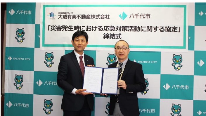 大成有楽不動産(株)は8日、千葉県八千代市と「災害発生時における応急対策活動に関する協定」を締結したと発表した。