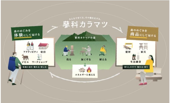 カラマツの幹を建材や家具に、枝は生活道具に、枝葉はチップやアロマ・エネルギーへと形を変えて丸ごと使用。また、地域内で加工・流通させることで運搬エネルギーを最小化するなどして、森の土壌や生態系を守りながら森と人が共生できる方法を探っていく。