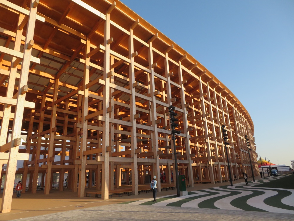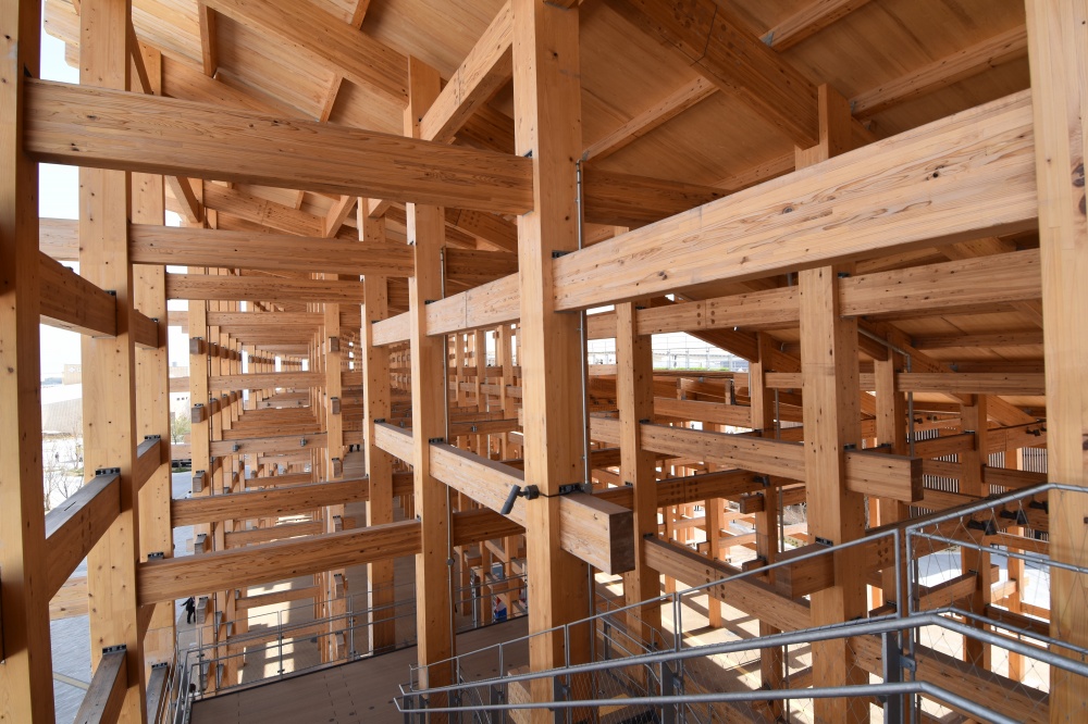 その構造は、寺社仏閣で使われている「貫(ぬき)」という日本の伝統的な接合に、現代の技術を掛け合わせて作られている。使用されている木材は7割が国産のスギとヒノキ。残りの3割は外国産のオウシュウアカマツ。建築面積6.1万平方メートル、世界最大の木造建築物としてギネスブックにも登録されている。
