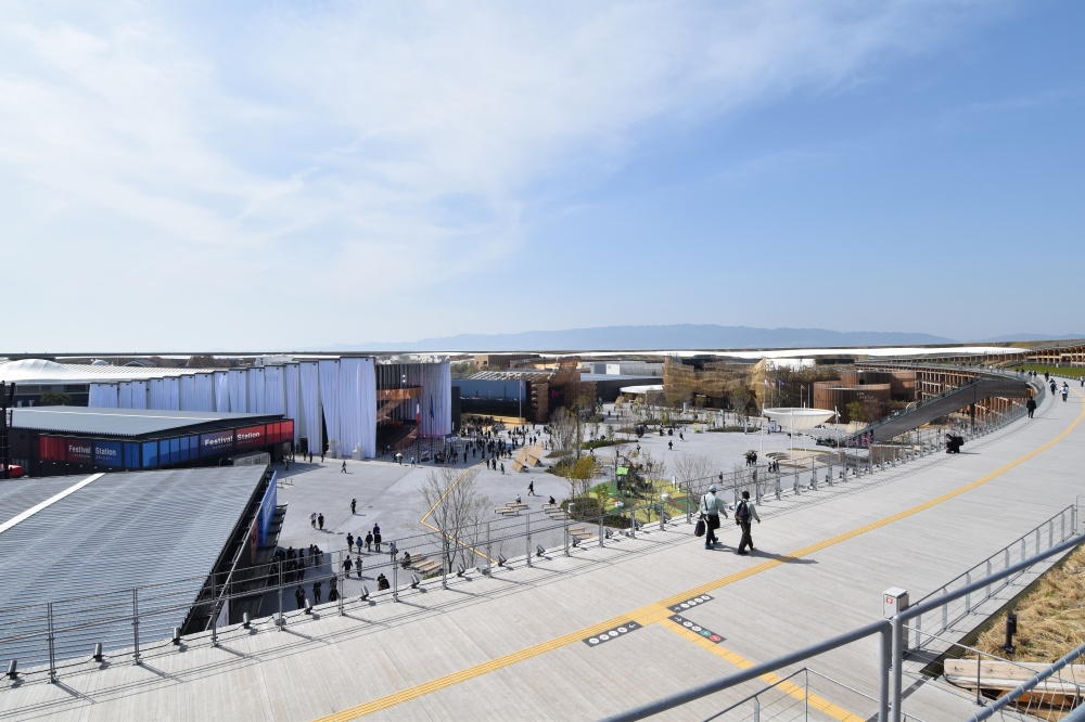 リングの下は、来場者が行き交う通路であり、風雨を避けられる滞留空間でもある。近年は猛暑になることが多いが、大屋根によって日陰をつくり避暑の空間にもなる。見上げると、縦横に無数の木組みがあり、その光景は圧巻の一言。エレベーターやエスカレーター、階段を使って最高高さ20mの屋上まで登れば、そこは幅30mの遊歩道となっている。遊歩道は思った以上に快適だし、上空から万博の開催エリア内を見渡した景色は壮観だ。メディアデーの当日はよく晴れていたので、非常に気持ちよく歩けた。個人的にはこれだけで万博に来る価値があると感じた。