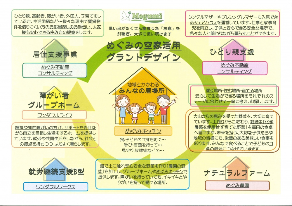 同社では、社会課題解決に向けさまざまな取り組みを進めてきた。めぐみ食堂のオープンより前の19年、(一社)ワンダフルライフを立ち上げ、空き家を活用し精神・知的障がい者を対象にしたグループホームの運営に着手した。これは、「知的・精神障がい者の入居に、オーナーさんはどうしても二の足を踏む。問題ないという事例があれば、オーナーさんは姿勢を変えてくれるはず」(同氏)。この思いから、自ら運営に乗り出した。空き家をグループホームにする形で、現在9施設を運営している。